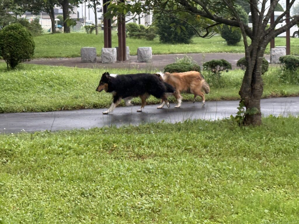 曇り空ではあるけど雨も上がってやっとワンコも朝のお散歩に出かけられました。