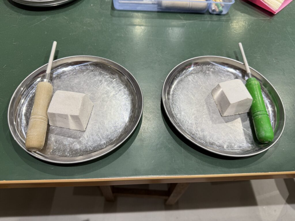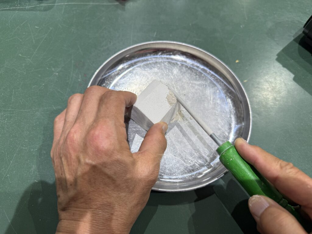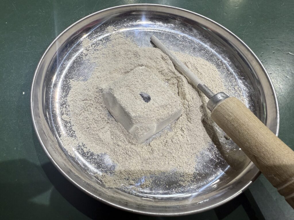 そして今年も化石発掘ミニ体験。小さな化石が予め石膏の中に隠されていています。それを削りながら中の化石を傷つけないように発掘していきます。今年は鉱石の発掘ミニ体験をしました。