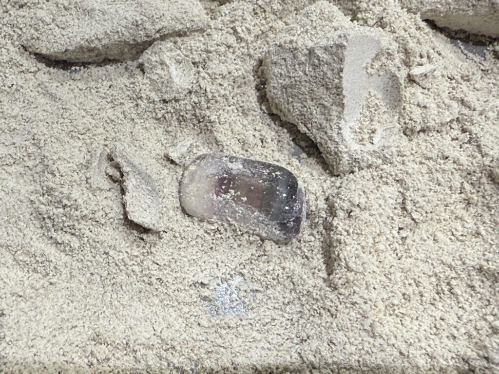 発掘出来たら水できれいに洗います。出てきた鉱石は蛍石(フローライト)。