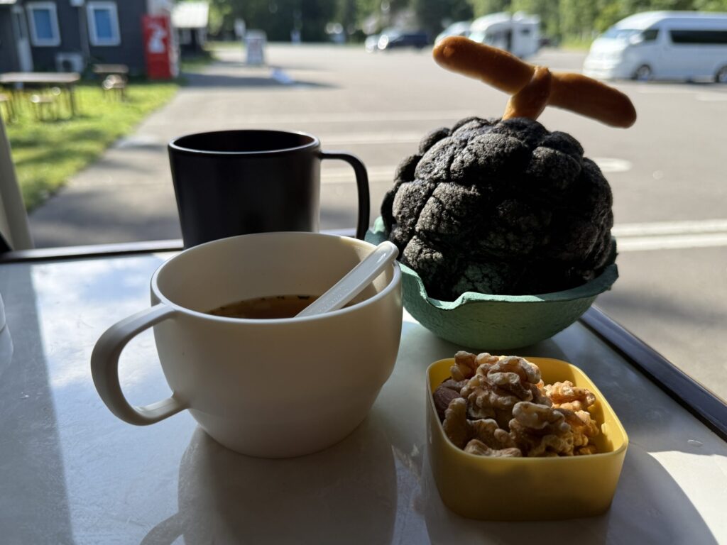 青い池往復のたっぷりお散歩から帰ってきて、今朝の朝食は昨日道の駅夕張メロードで買った黒メロンパン