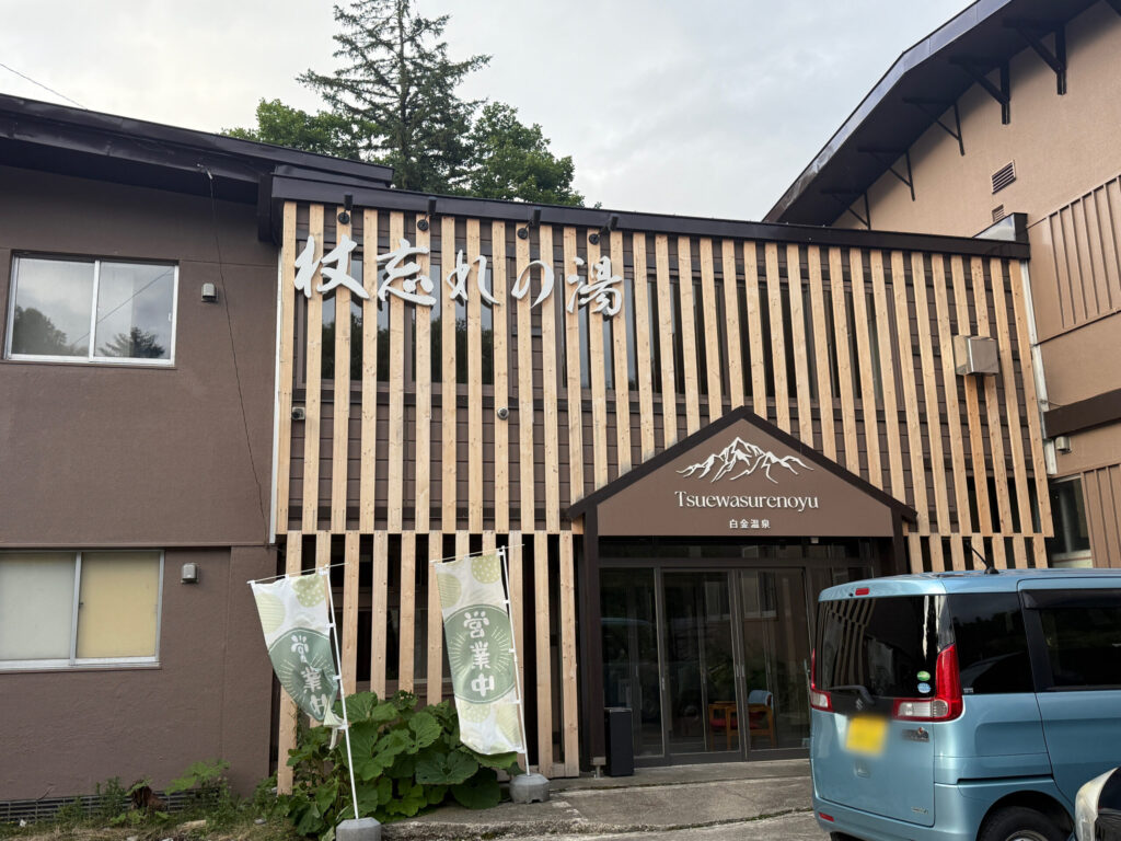 ♨杖忘れの湯…白金温泉にある小さな温泉宿。小さな内湯と外への扉を開けたらいきなり湯舟の小さな露天風呂。日帰り入浴は11:00~17:00 料金は¥700