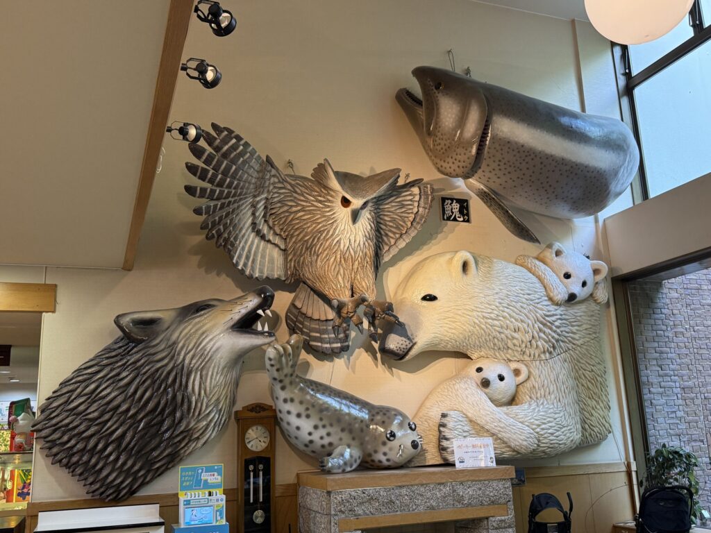 鍾乳洞見学の間はワンコは車でお留守番なので、出てきたら裏山の散策路へと思っていたのですが、この日は猛烈に暑く、この気温で外を歩かせるのはかわいそうだという事になり、急遽予定変更。買ってきたおにぎりを車の中で食べて昼食を済ませ、旭川の博物館へ行く事にしました。