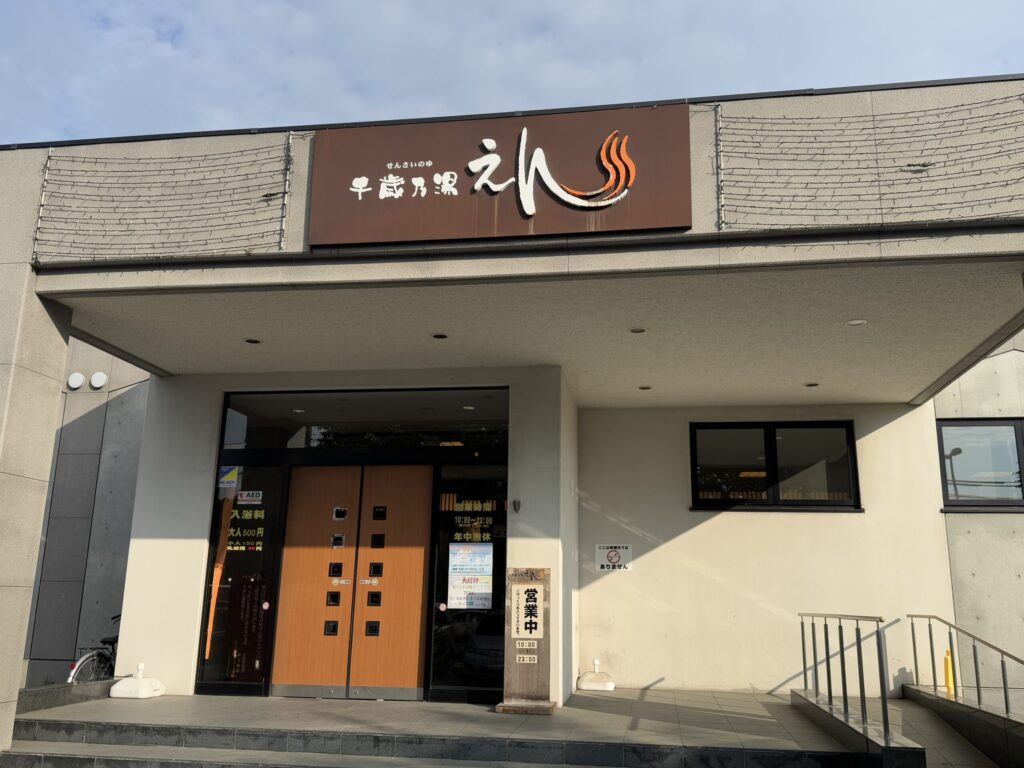 ♨千歳乃湯えん…三つ(岩風呂、薬湯、檜)の露天風呂にサウナ、ジェットバス、寝湯といった施設を備える日帰り入浴施設。年中無休で営業時間は10:00~23:00。料金は大人\500-。シャンプーとボディーソープはなし。
