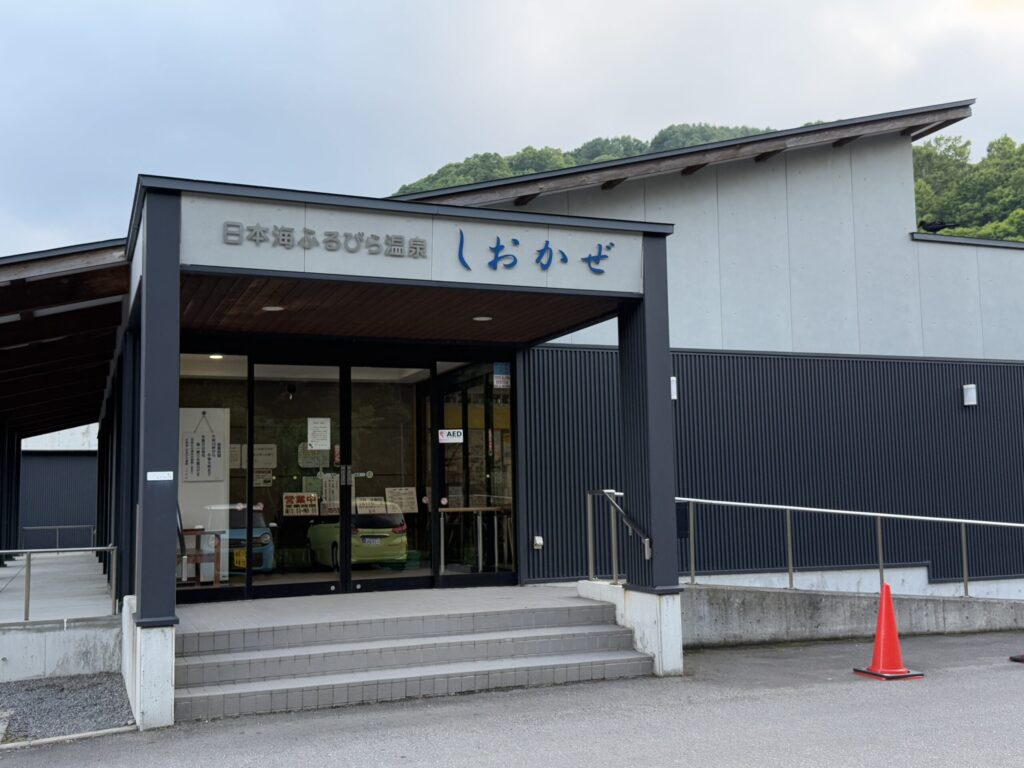 日本海ふるびら温泉「しおかぜ」…坂の上にある建物は番屋をイメージしたデザインが特徴的。源泉掛け流し。内風呂、露天風呂、サウナ(TVなし)、水風呂  シャンプーリンス備え付け ¥500 シンプルだけどとてもくつろげるいい入浴施設です。