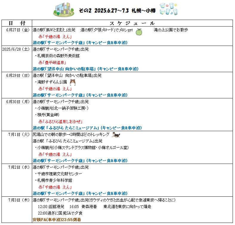 7月3日(木) 道の駅サーモンパーク千歳~東京へ(東北道安積PAで車中泊)