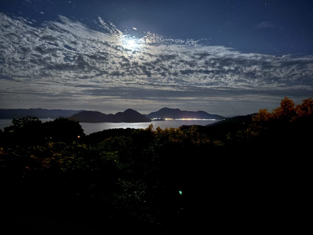 入浴後はこの日も宿泊場所としている道の駅とうや湖へ。夕方の散歩と夕食の後、洞爺湖温泉で20:45から夏の間毎日打ち上げられる花火を、湖の対岸にある道の駅展望台から小さく見ることができました。