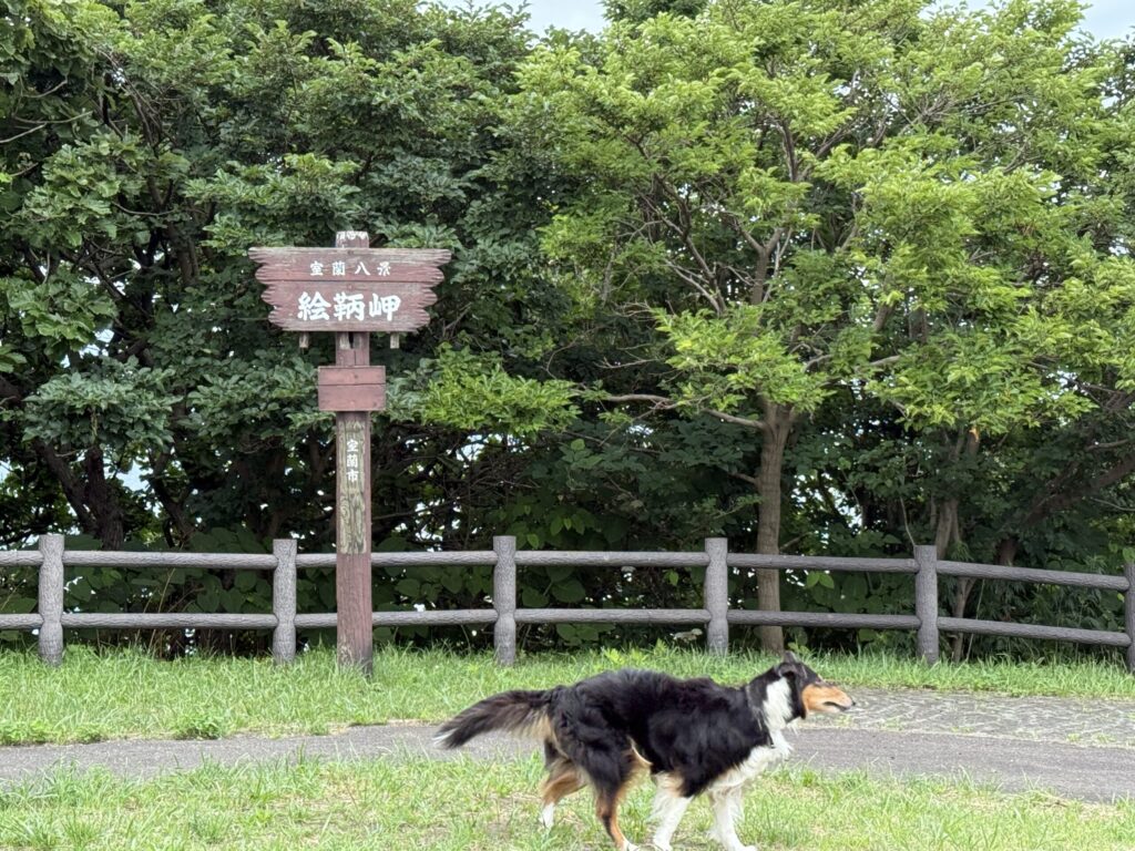 一日のスタートはワンコのお散歩から。ということで、昨日下見した候補地の中から絵鞆岬展望台に行ってみました。すると車が一台入ってきたので移動することに。