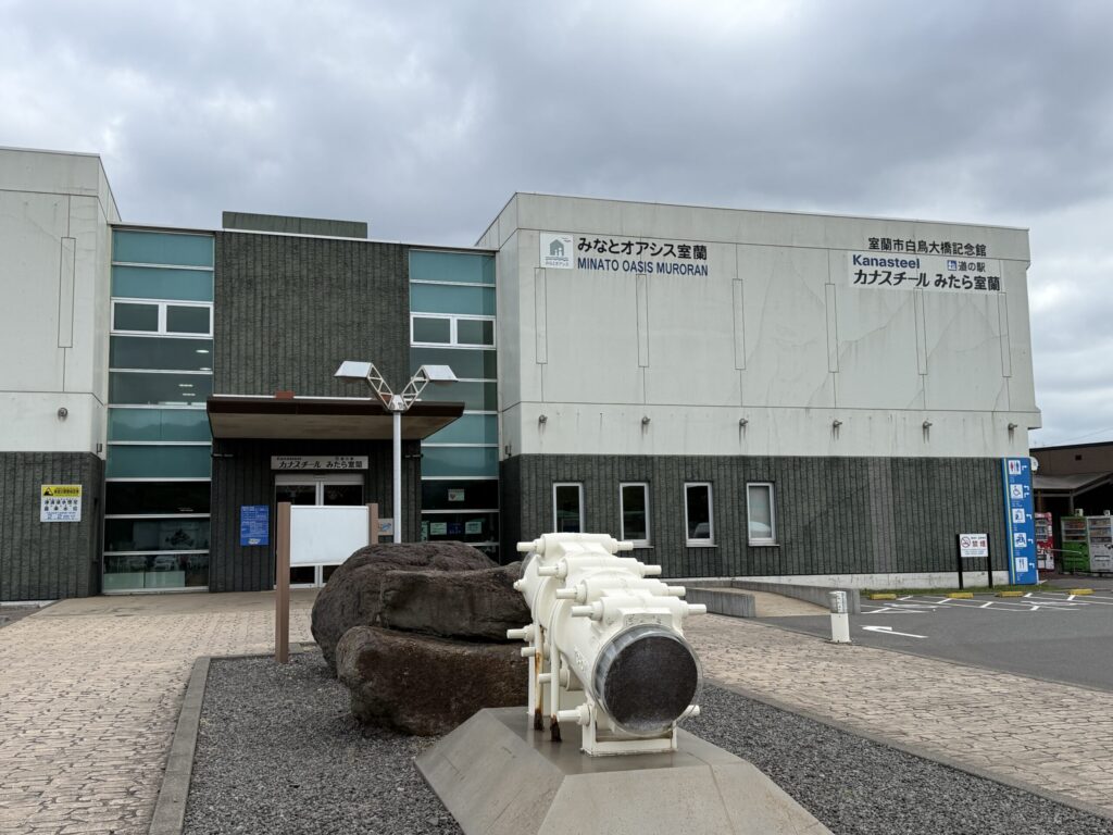 道の駅みたら室蘭…白鳥大橋建設に伴い整備された道の駅で、室蘭近郊の特産品を取り扱う売店のほか、飲食テナントが入るラウンジ、展示室(白鳥大橋建設や室蘭港にかかわる資料展示)、展望デッキ(白鳥大橋や大黒島などの眺望が楽しめる)を備えています。すぐ近くには水族館や入浴施設もあり、観光客をはじめ、市民も気軽に立ち寄る道の駅です。