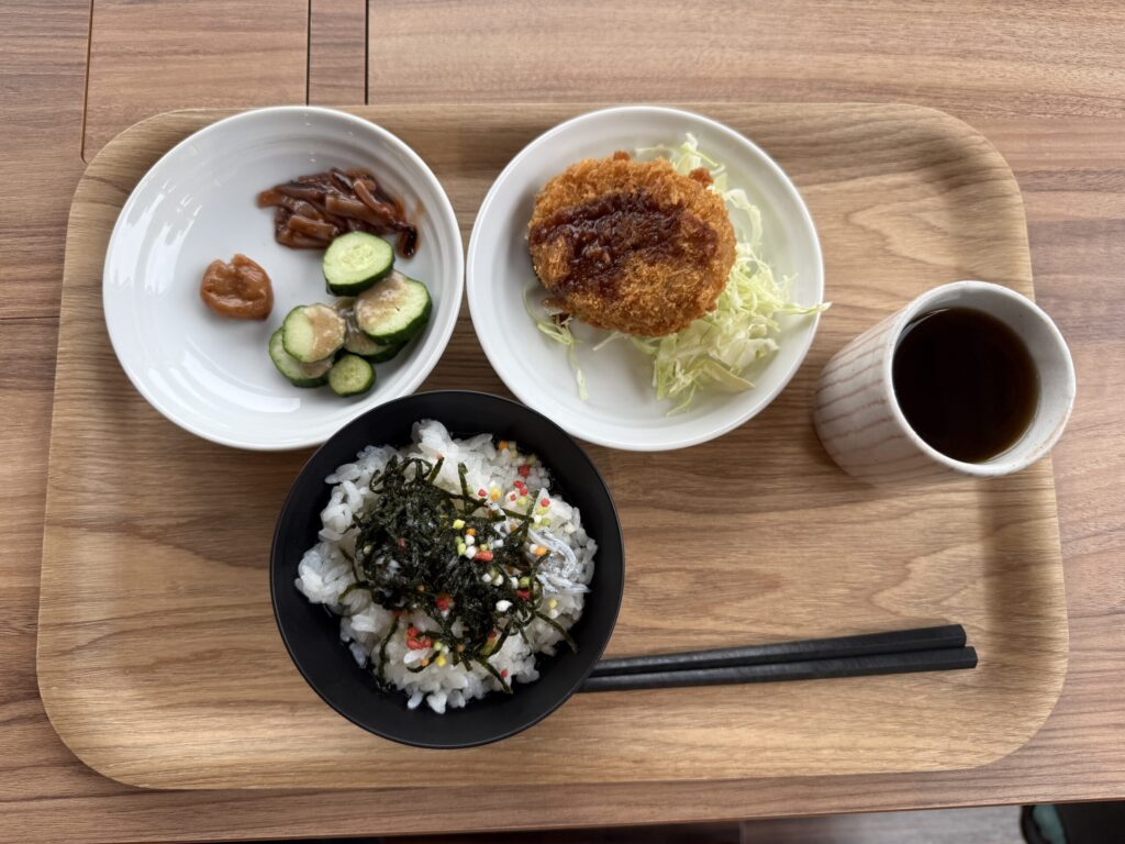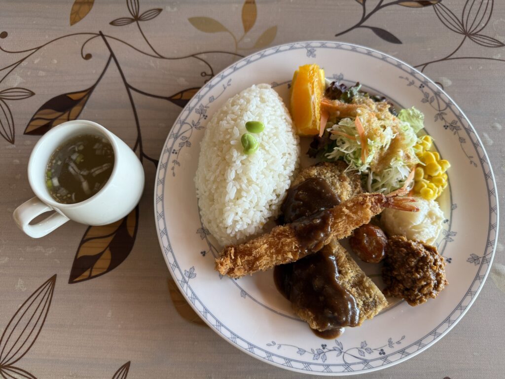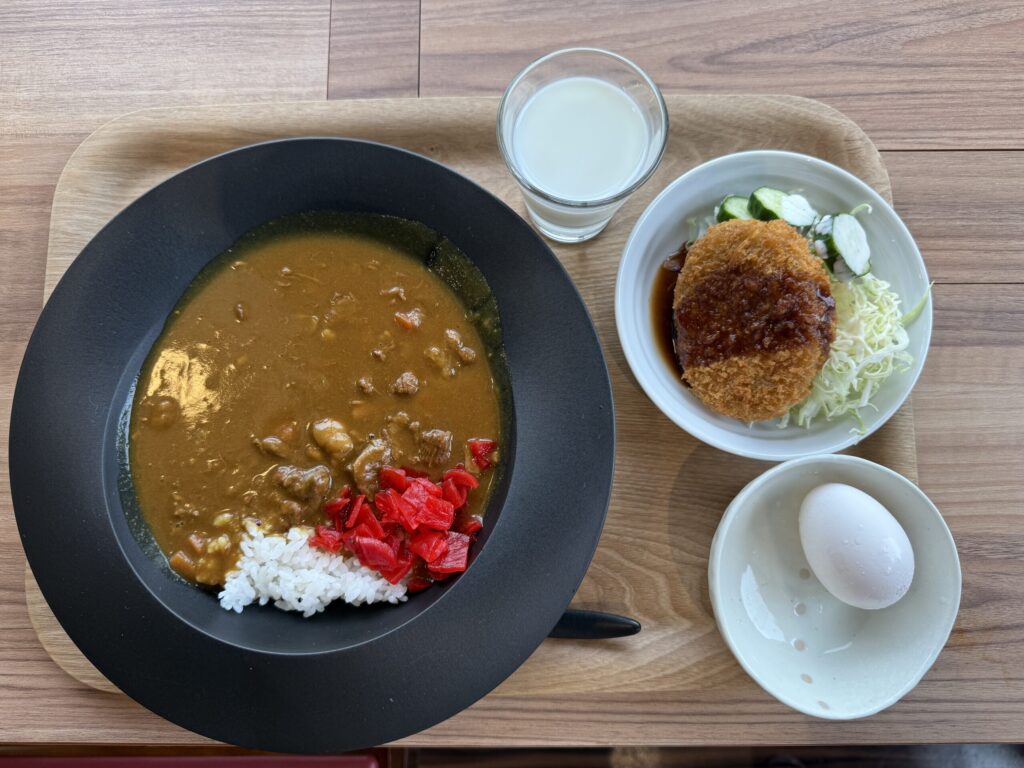 腸詰にしたソーセージが「乾燥・燻製・冷却」の工程で出来上がる1時間半を利用して、施設内にあるレストラン「カウベル」で昼食。