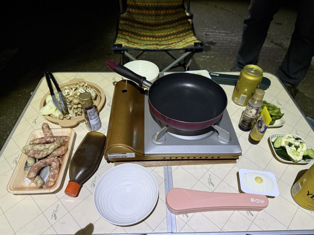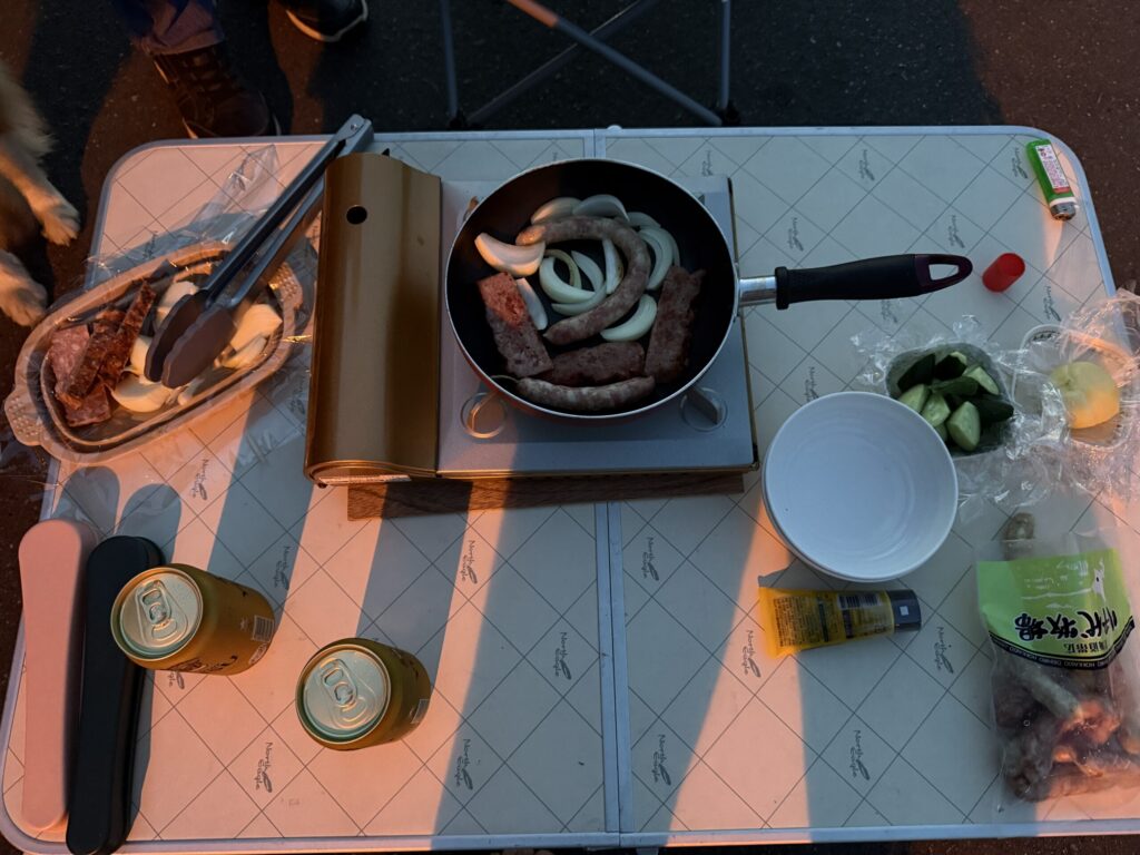 「道の駅でキャンプ食」は本当はダメなんだけど、車も少なく、駐車場の一番端に場所を確保できたので、今日作ったソーセージを早速いただきました。