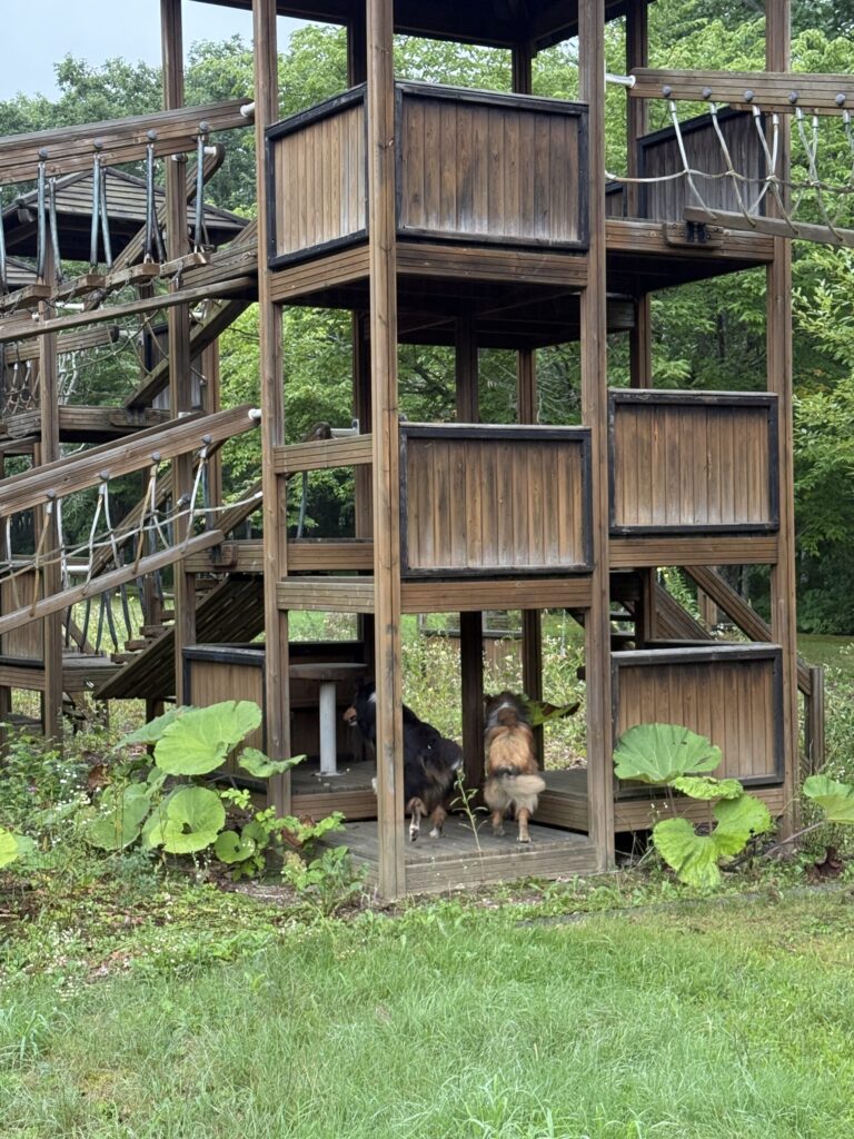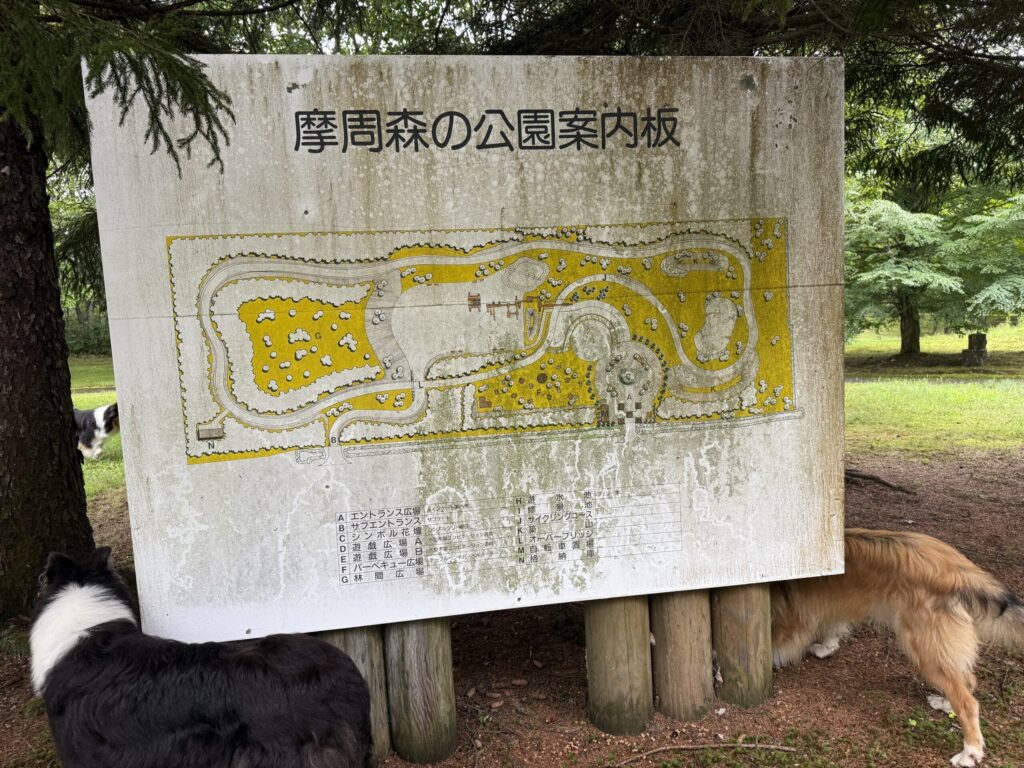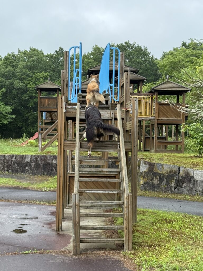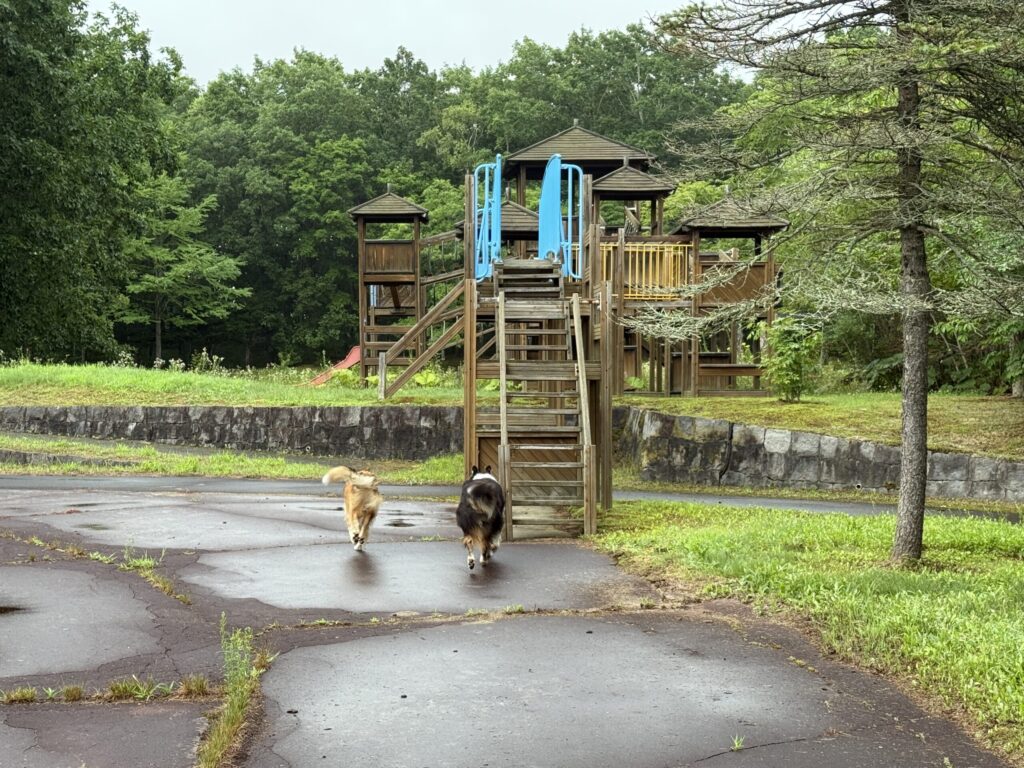 ワンコの朝のお散歩はキャンプ場の隣にある「摩周森の公園」入るとすぐに子供用アスレチックがあるのを見つけて喜んで飛んでいくハイジとアイラ。誰もいなくて楽しくお散歩した2匹。ガウディはマイペースでのんびり。