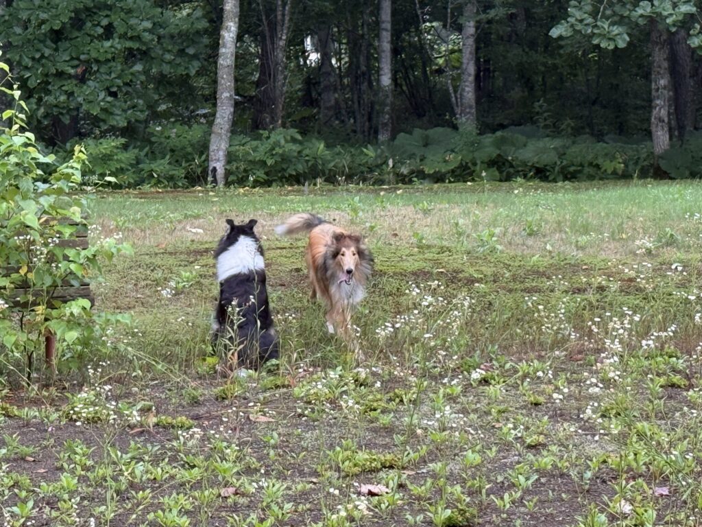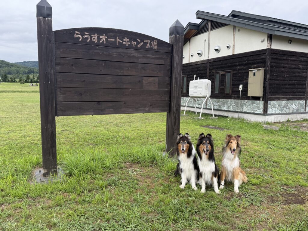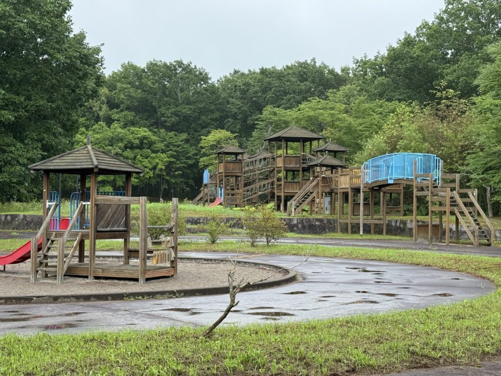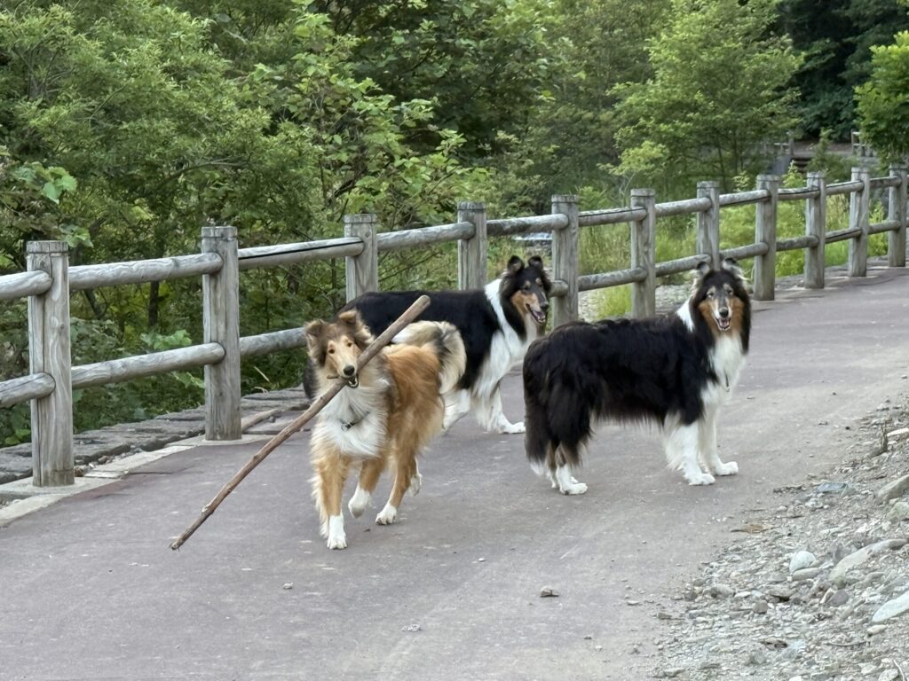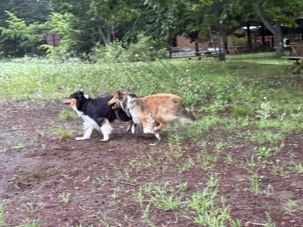 ワンコの朝のお散歩はキャンプ場の隣にある「摩周森の公園」入るとすぐに子供用アスレチックがあるのを見つけて喜んで飛んでいくハイジとアイラ。誰もいなくて楽しくお散歩した2匹。ガウディはマイペースでのんびり。