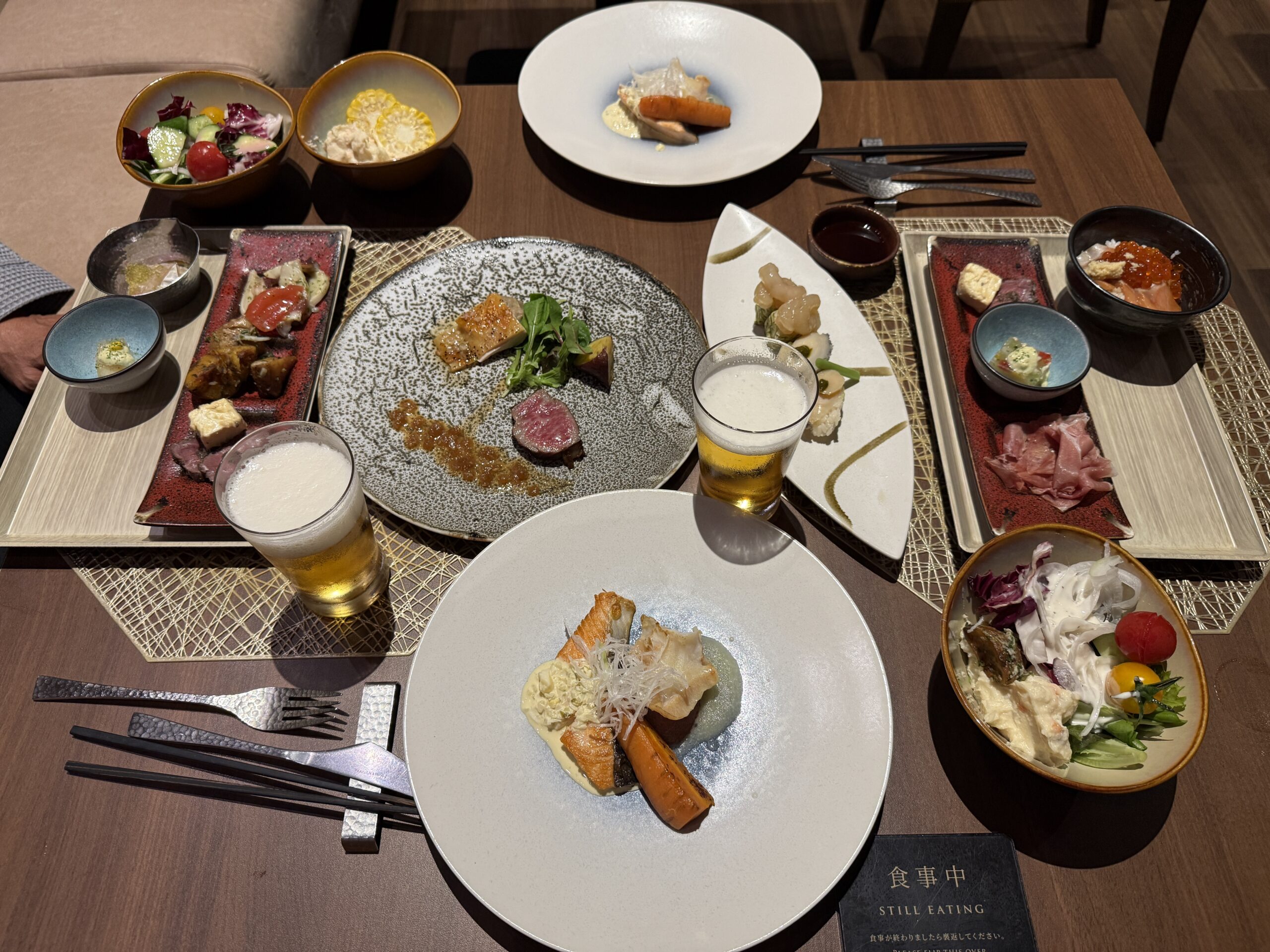 午後はのんびりとホテルで過ごし(わんズ、ごめんね)、夕方、ペレケ川河岸公園にお散歩に行ってやった後は、眺めの素晴らしい露天風呂とサウナのある展望台大浴場でゆっくり入浴。夜は豪勢なバイキング料理。