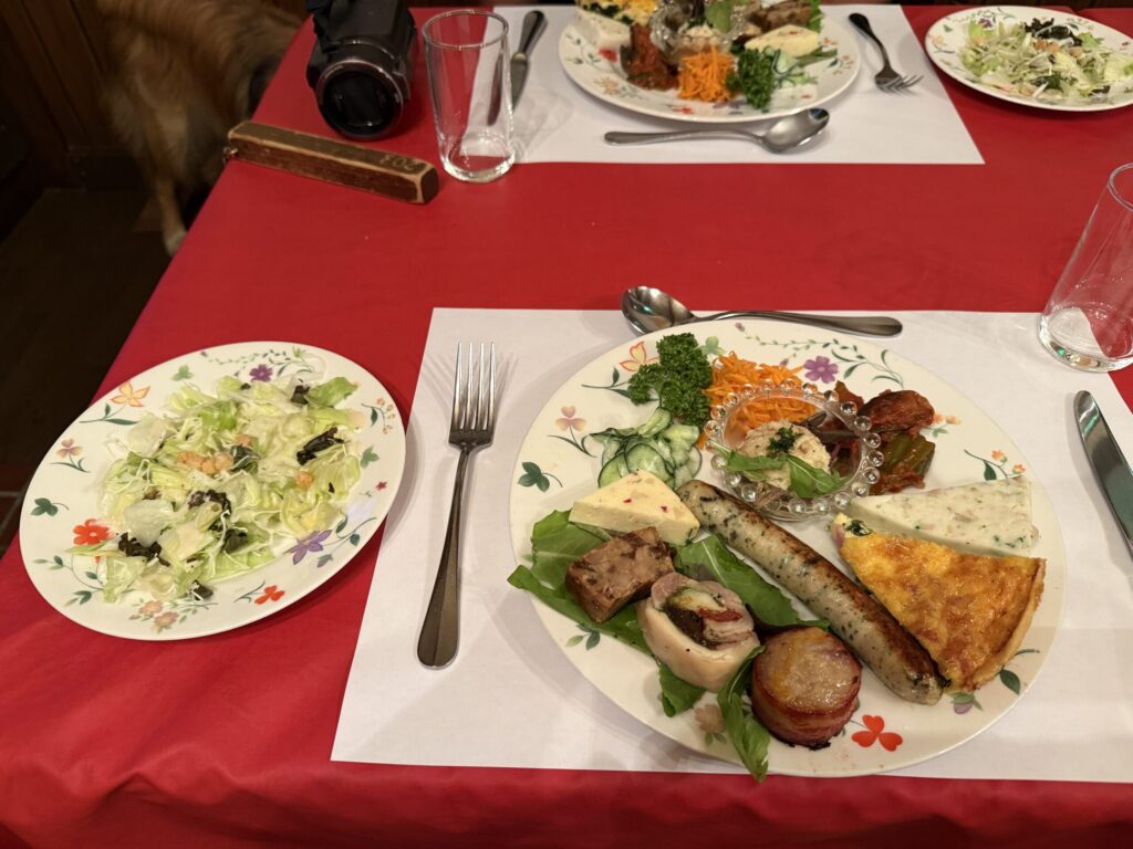 チェックイン後すぐに夕食。これが冗談かと思うほどの量で、美味しいんだけど、マイッタ(^^;