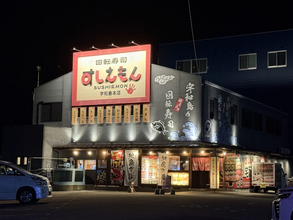 佐田岬での散策後、この日の宿泊地の「道の駅宇和島きさいや広場」に向けて出発。途中、八幡浜にある「黒湯温泉みなと湯」で入浴。夕食は道の駅から歩いて行ける「回転寿司(すしえもん)」で取り、車中泊。