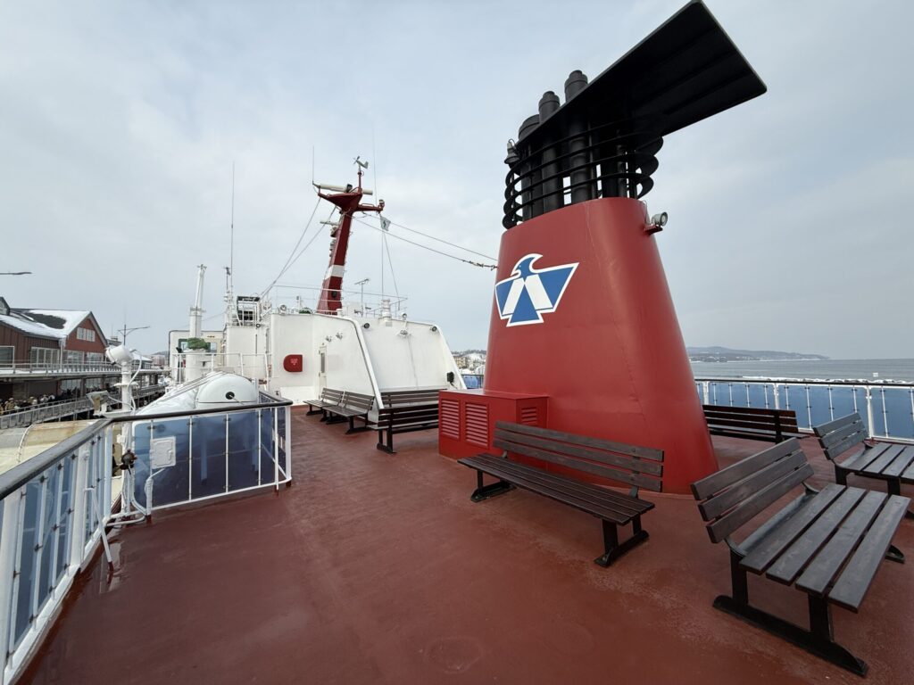 この日は比較的暖かかったけど海上は寒そうなので、防寒ズボンを履いて帽子も被り、カイロもポケットに携帯。望遠鏡も持参してワクワクと出航を待ちます。