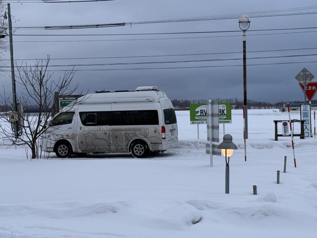 本当にこれはまずい、やばい!!という事でワンコをトイレだけさせてすぐに車に戻し、峠を後にしてRVパーク峠の湯びほろへ。峠から美幌市内に向かって22kほどの場所にあるRVパークまで慎重に運転をして、何とか無事到着。